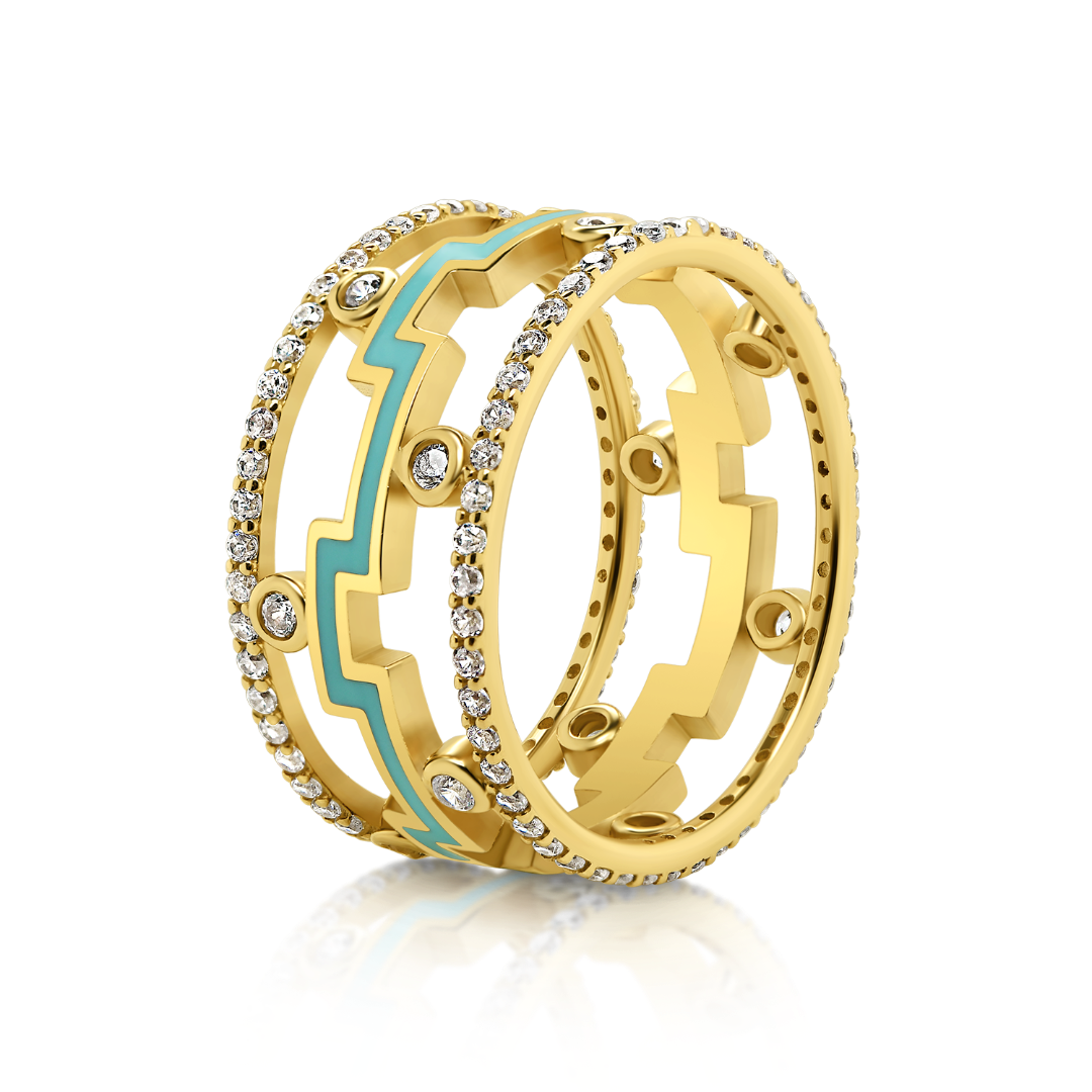 Inel din aur galben de 14K, încrustat cu pietre Cubic Zirconia și Email colorat.