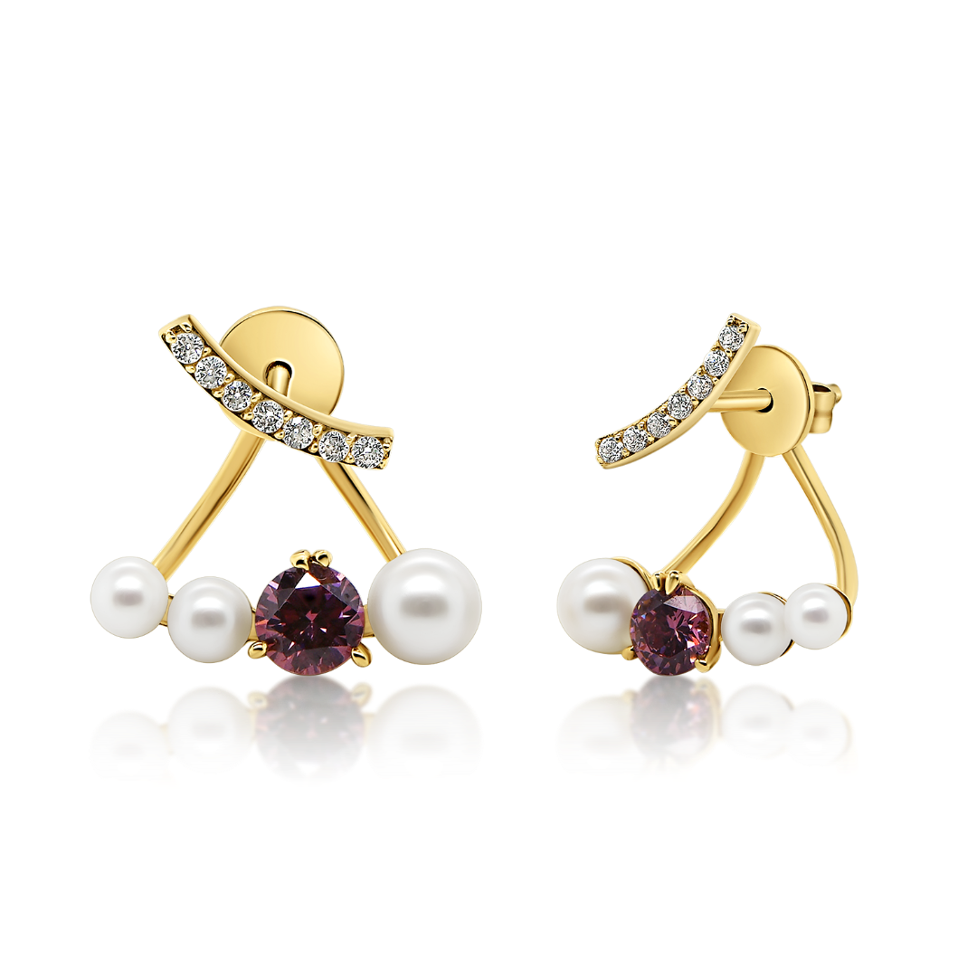 Cercei din aur galben de 14K cu Perle de apă dulce, Rodolit și pietre Cubic Zirconia.