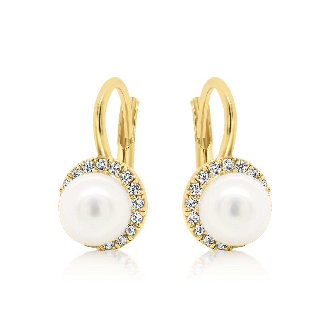 Cercei din aur galben de 14K, cu Perle de cultură și pietre cubic zirconia.