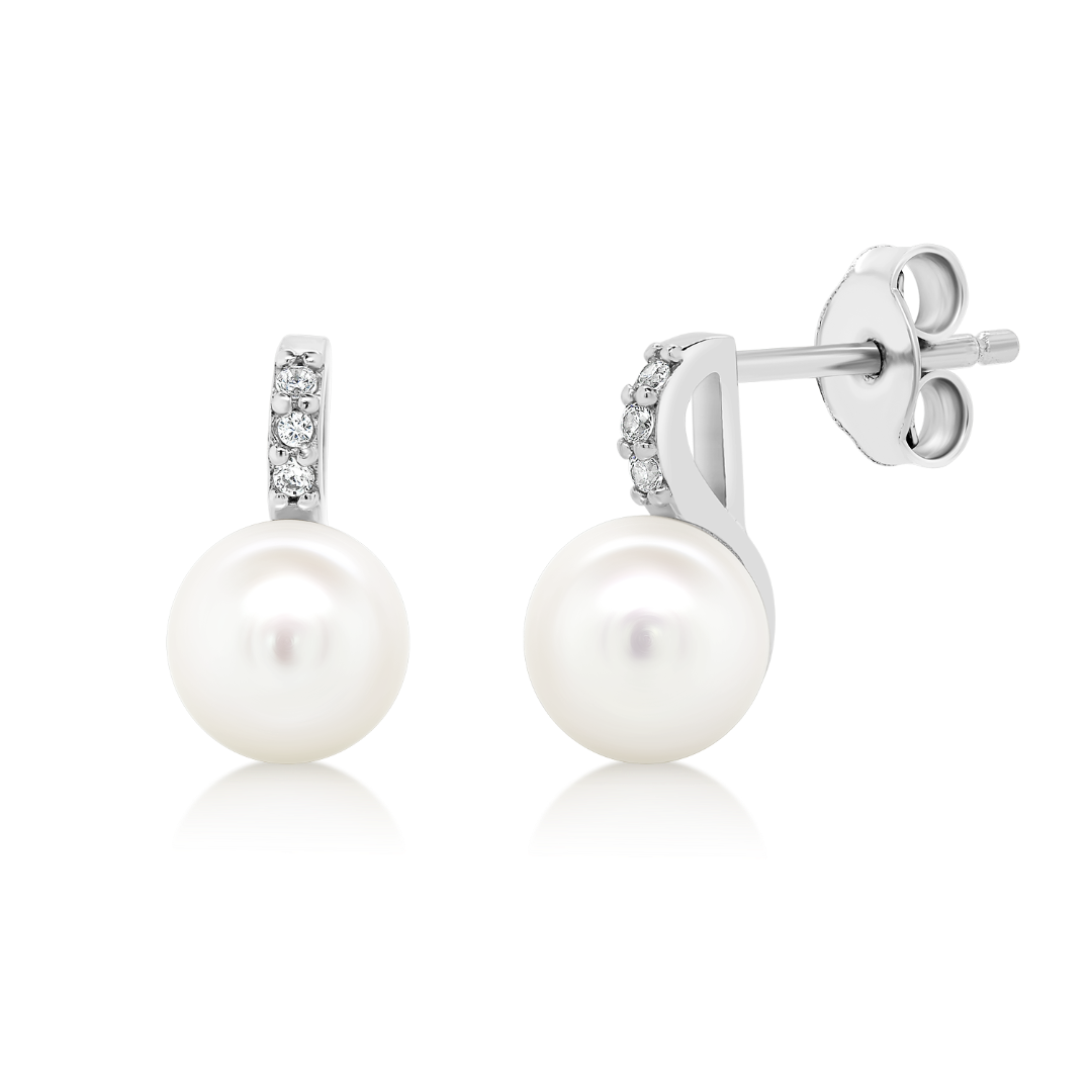 Cercei din aur alb de 14K, cu pietre cubic zirconia incolore și Perle de cultură.