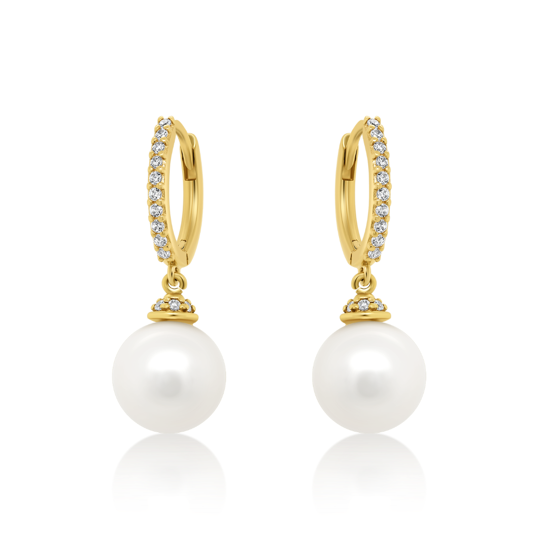 Cercei din aur galben de 14K, cu Perle de apă dulce și pietre Cubic Zirconia albe.
