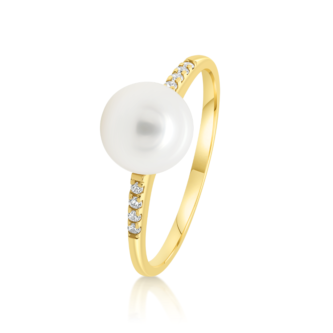 Inel din aur galben de 14K, cu Perlă și pietre Cubic Zirconia albe.