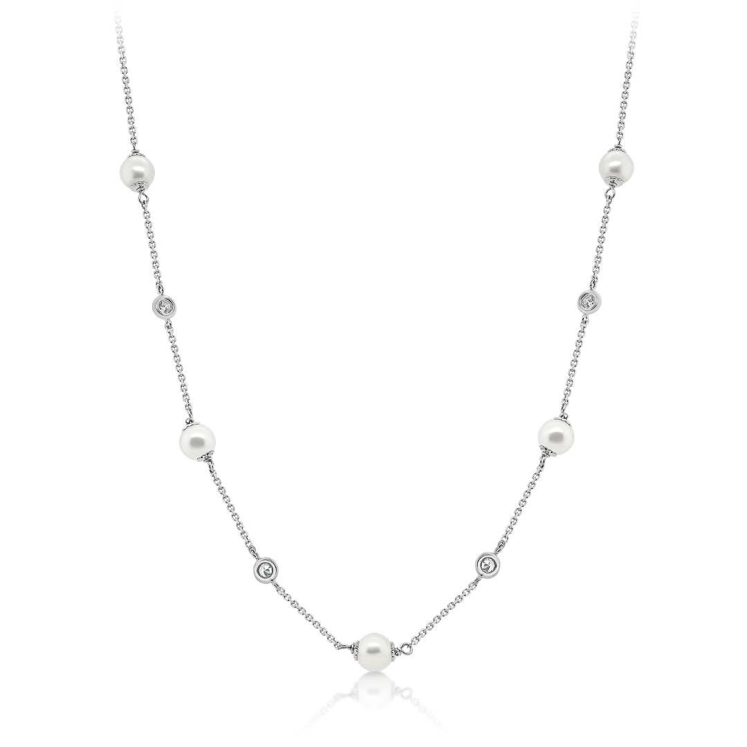 Colier din aur alb de 14K cu Perle albe de cultură și zirconia incolore.