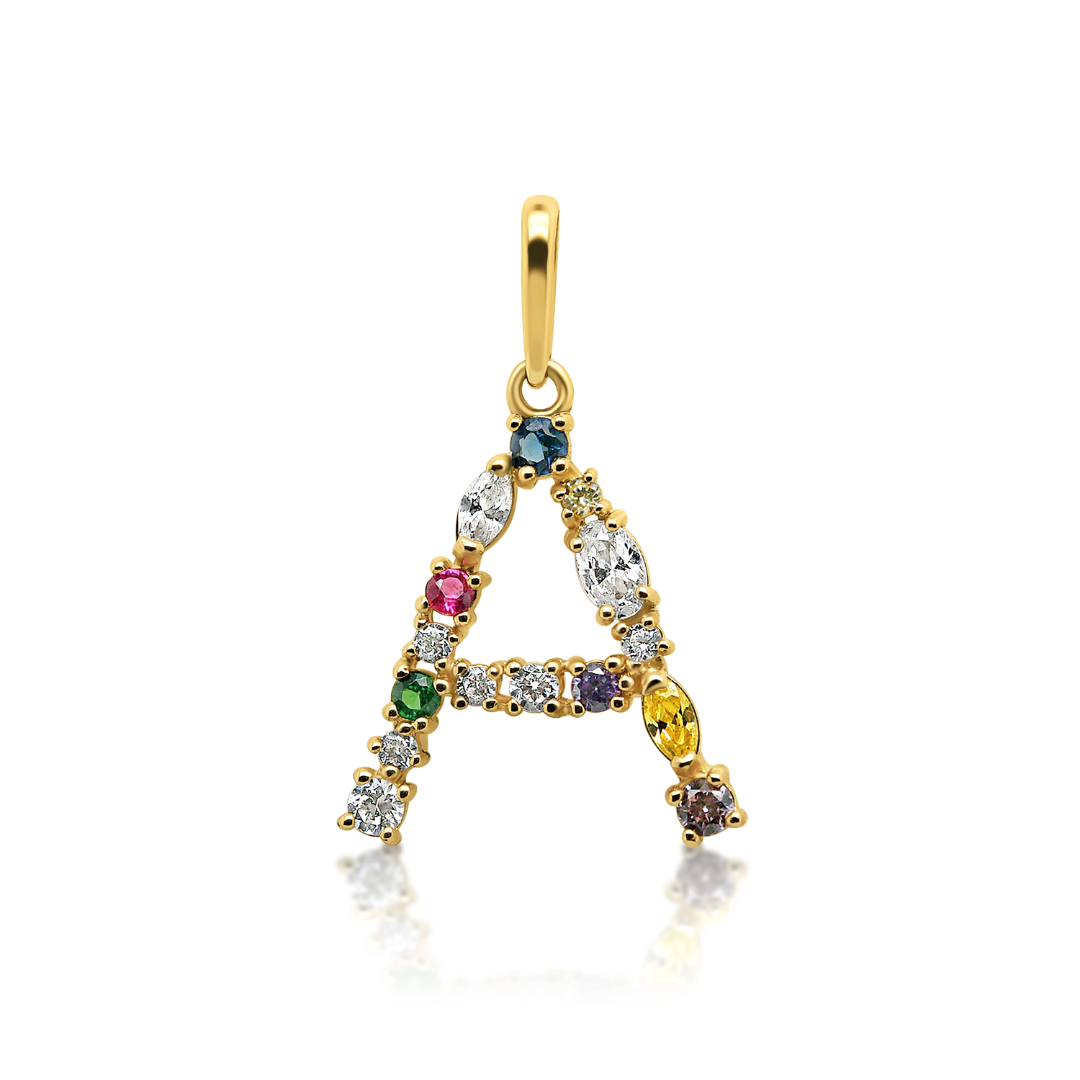 Pandantiv litera A din aur galben de 14K cu pietre cubic zirconia colorate.