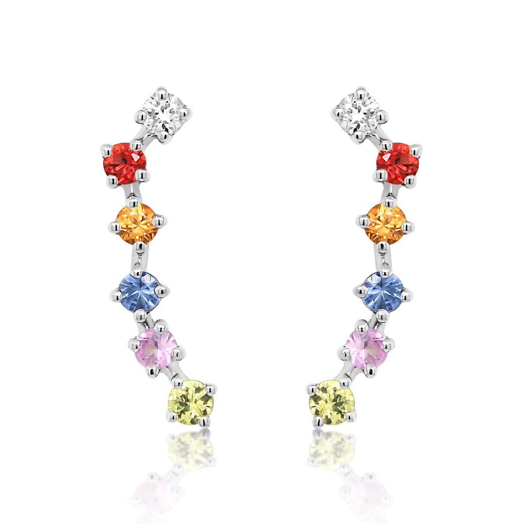 Cercei din aur alb de 18K cu două Diamante naturale Round Brilliant de 0.06ct și 10 Safire Fancy de 0.39ct.