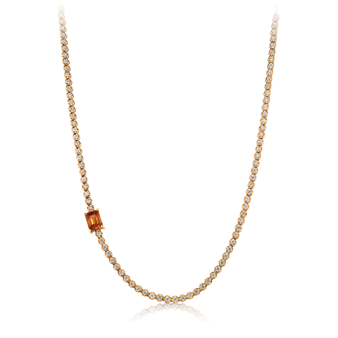 Colier Tennis din aur roz de 18K, încrustat cu 88 Diamante Brilliant cut de 1.40ct și un Safir Fancy de 1.27ct.
