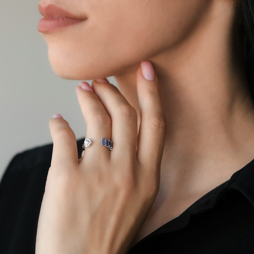 Inel din aur alb de 18K cu Diamante Brilliant cut, un Diamant Heart cut și 4 Safire albastre.