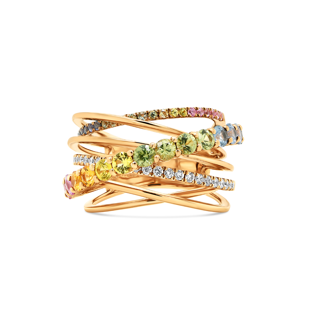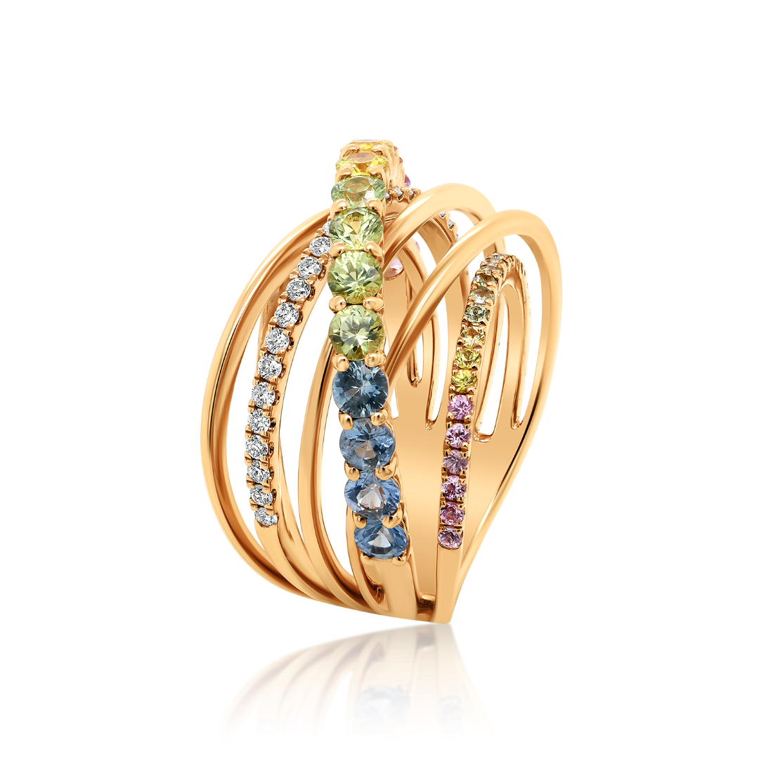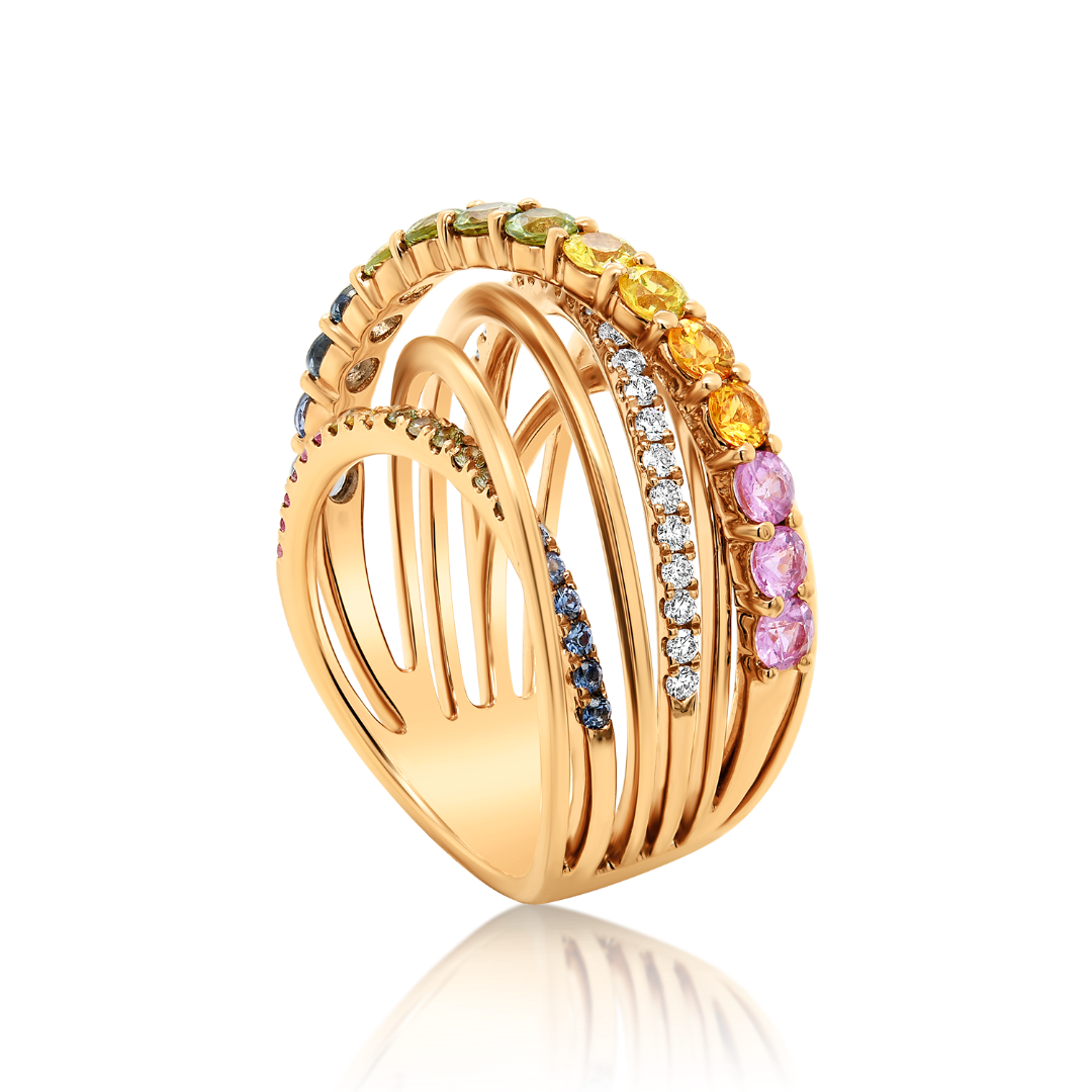 Inel din aur roz de 18K cu 26 de Diamante naturale Round Brilliant de 0.27ct și 36 de Safire Fancy cu o greutate totală de 1.98ct.