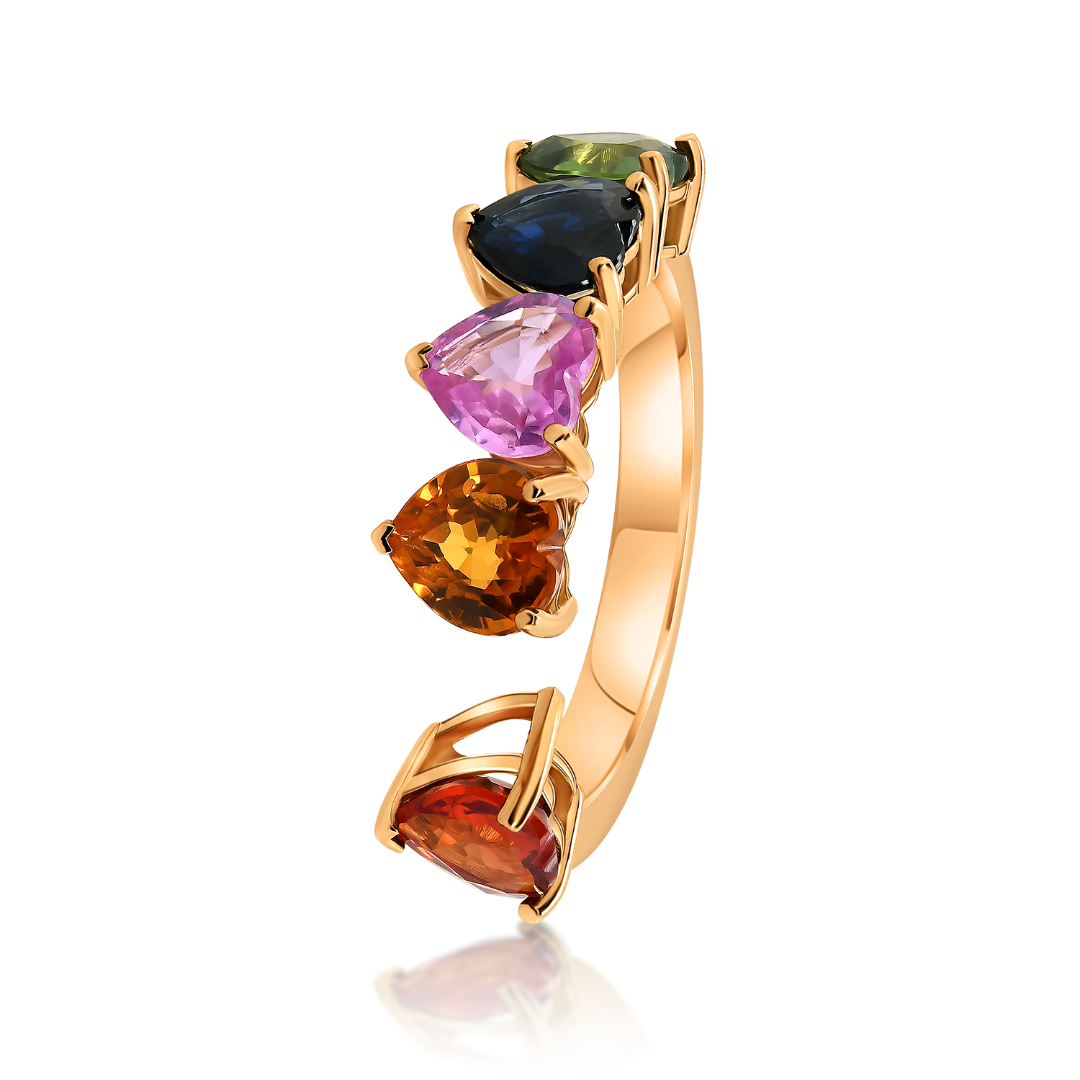 Inel din aur roz de 18K încrustat cu 5 Safire colorate Heart Cut.