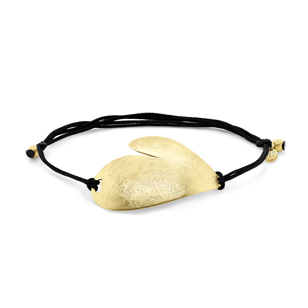 Brățară cu șnur negru și element inimă satinată din aur galben de 14K.