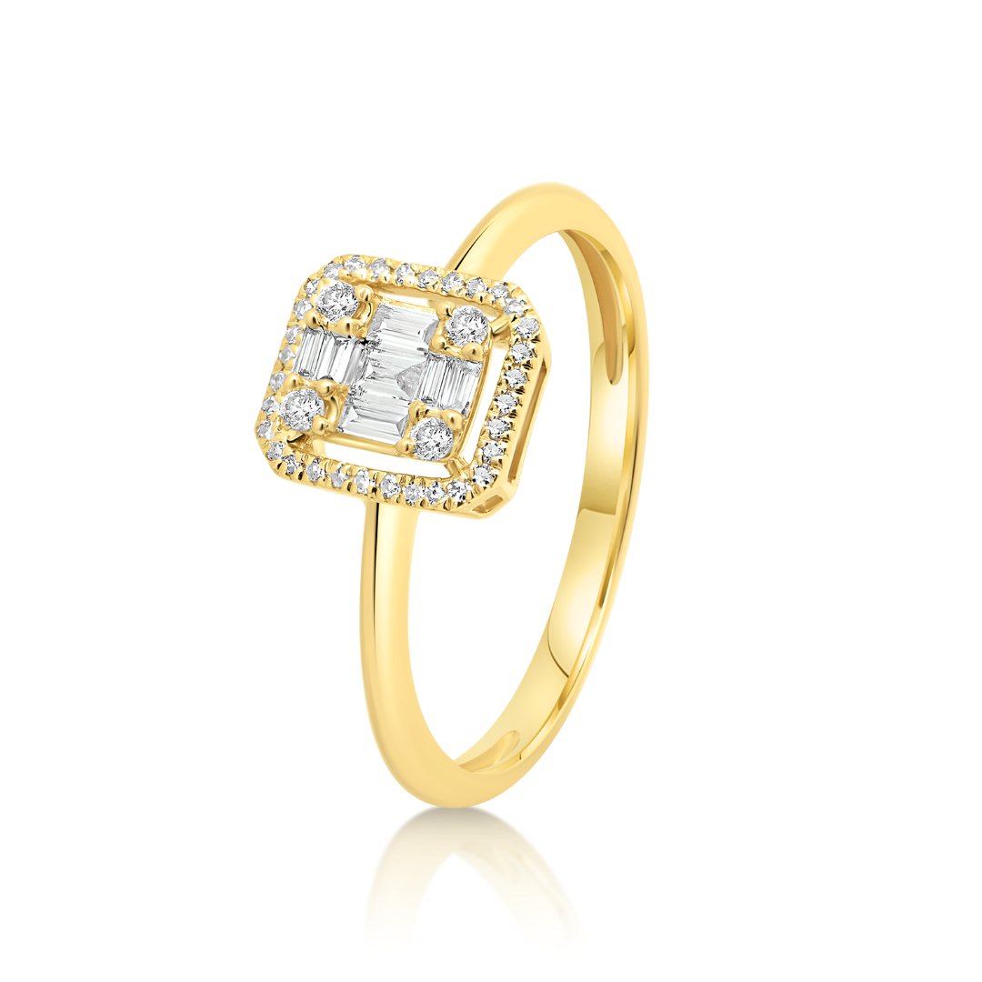 Inel de logodnă din aur galben de 18K încrustat cu 7 Diamante Baguette și 36 de Diamante Brilliant cut.