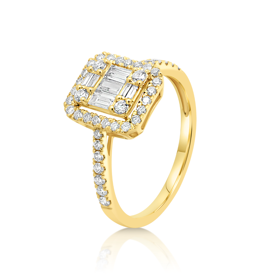 Inel de logodnă din aur galben de 18K încrustat cu 42 de Diamante Brilliant cut și 7 Diamante Baguette.