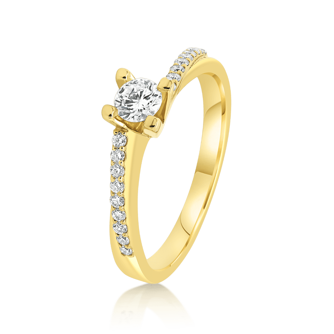 Inel de logodnă din aur galben de 18K, încrustat central cu un Diamant Round Brilliant de 0.165ct și 18 Diamante laterale de 0.09ct.