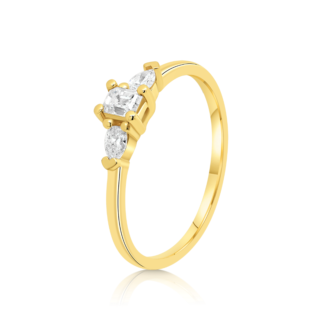 Inel de logodnă din aur galben de 18K încrustat cu două Diamante Pear și un Diamant Emerald cut, cu o greutate totală de 0.28ct.