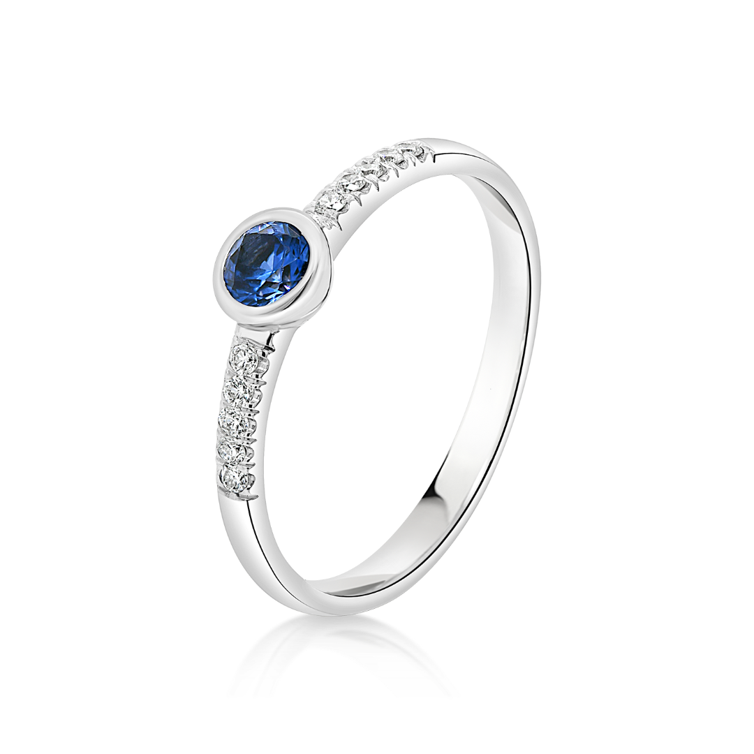 Inel de logodnă realizat din aur alb de 18K, încrustat cu 10 Diamante albe de 0.07ct. și Safir.