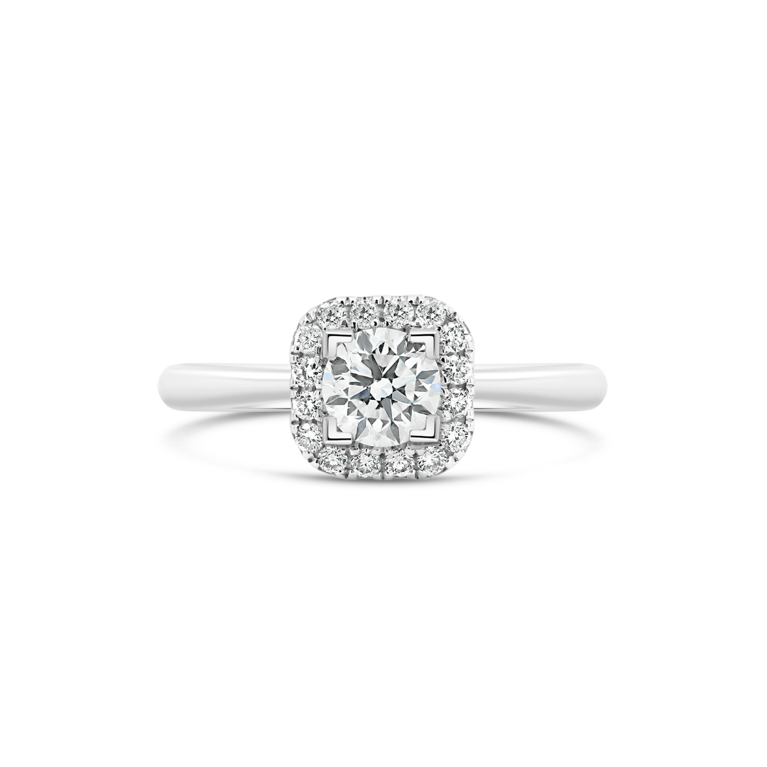 Inel de logodnă din aur alb de 18K, încrustat central cu un Diamant Brilliant de 0.50ct certificat la prestigiosul Institut Gemologic GIA cu numărul 6432956416 și lateral cu 16 Diamante de 0.146ct.