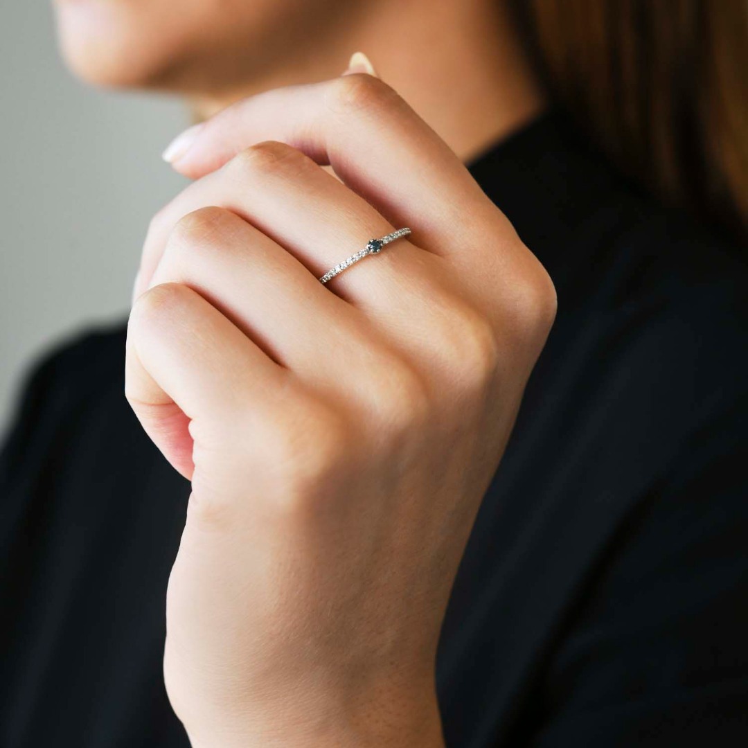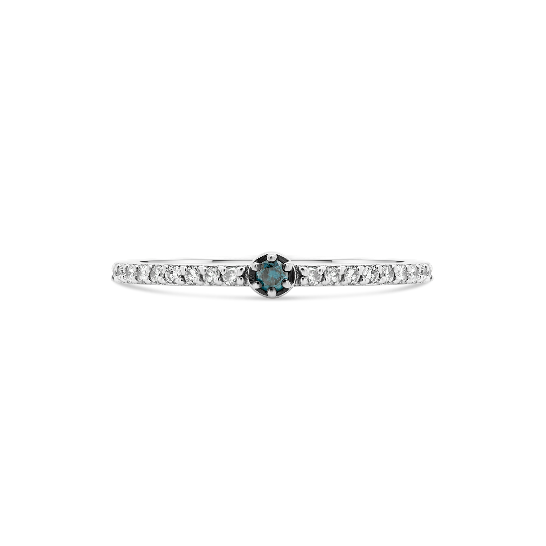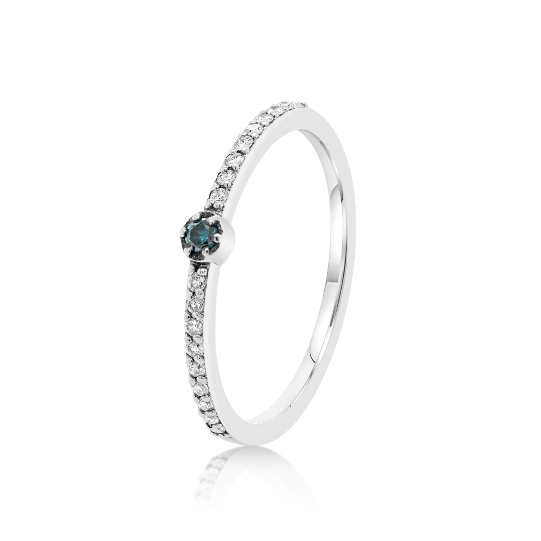 Inel de logodnă din aur alb de 18K, cu un Diamant central Ice Blue și 18 Diamante incolore.