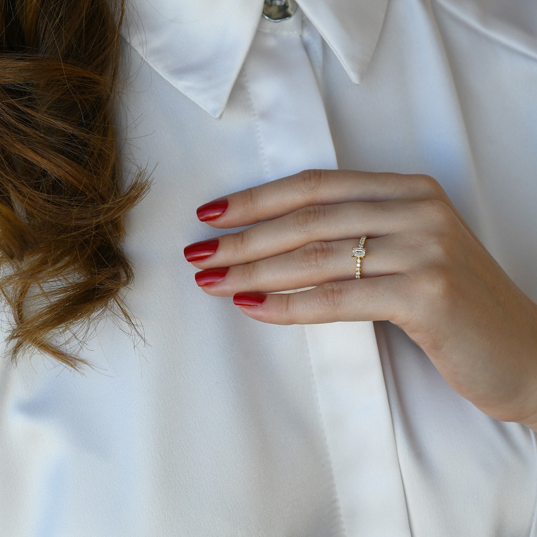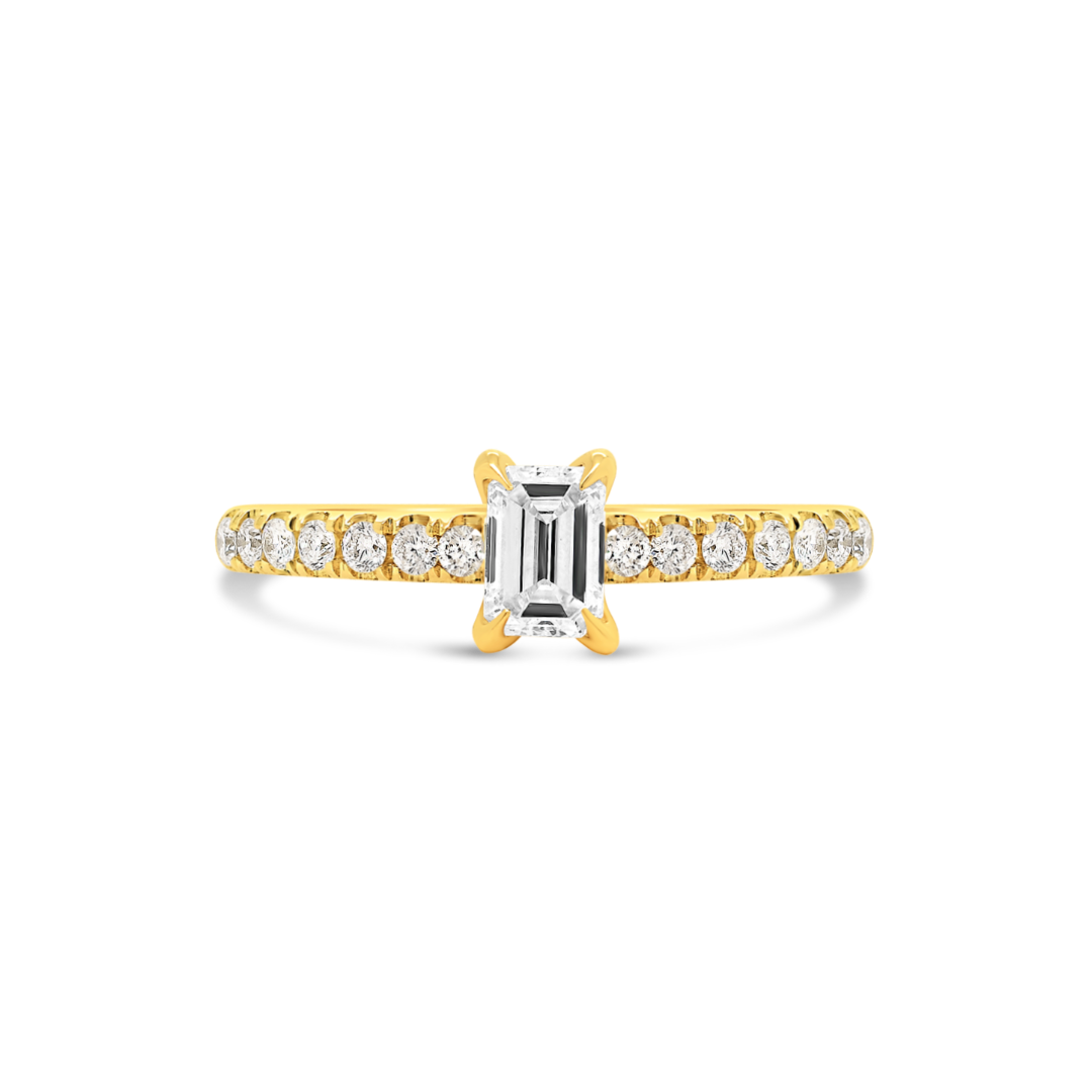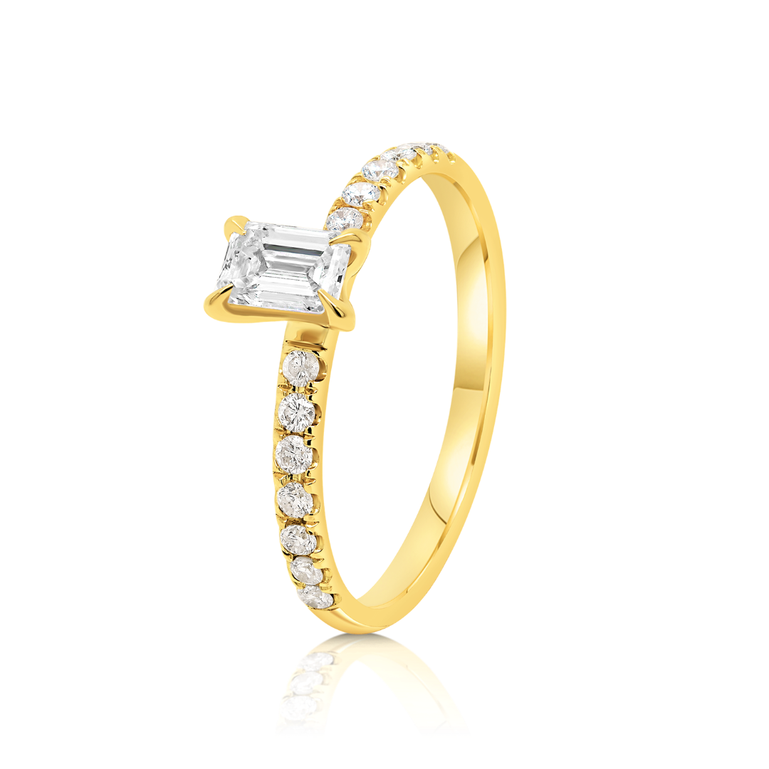 Inel de logodnă din aur galben de 18K, încrustat cu un Diamant Emerald și 14 Diamante Round Brilliant.