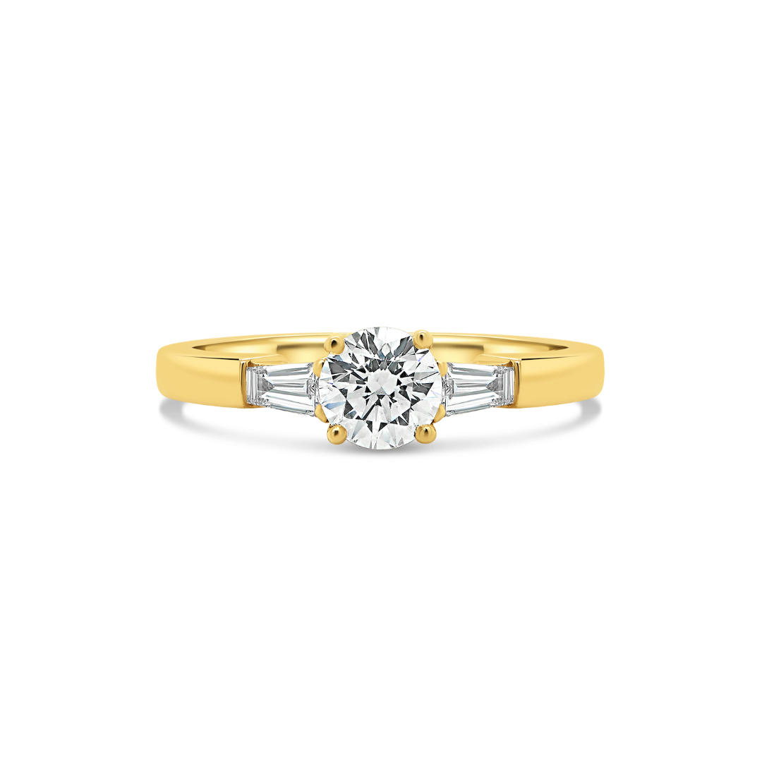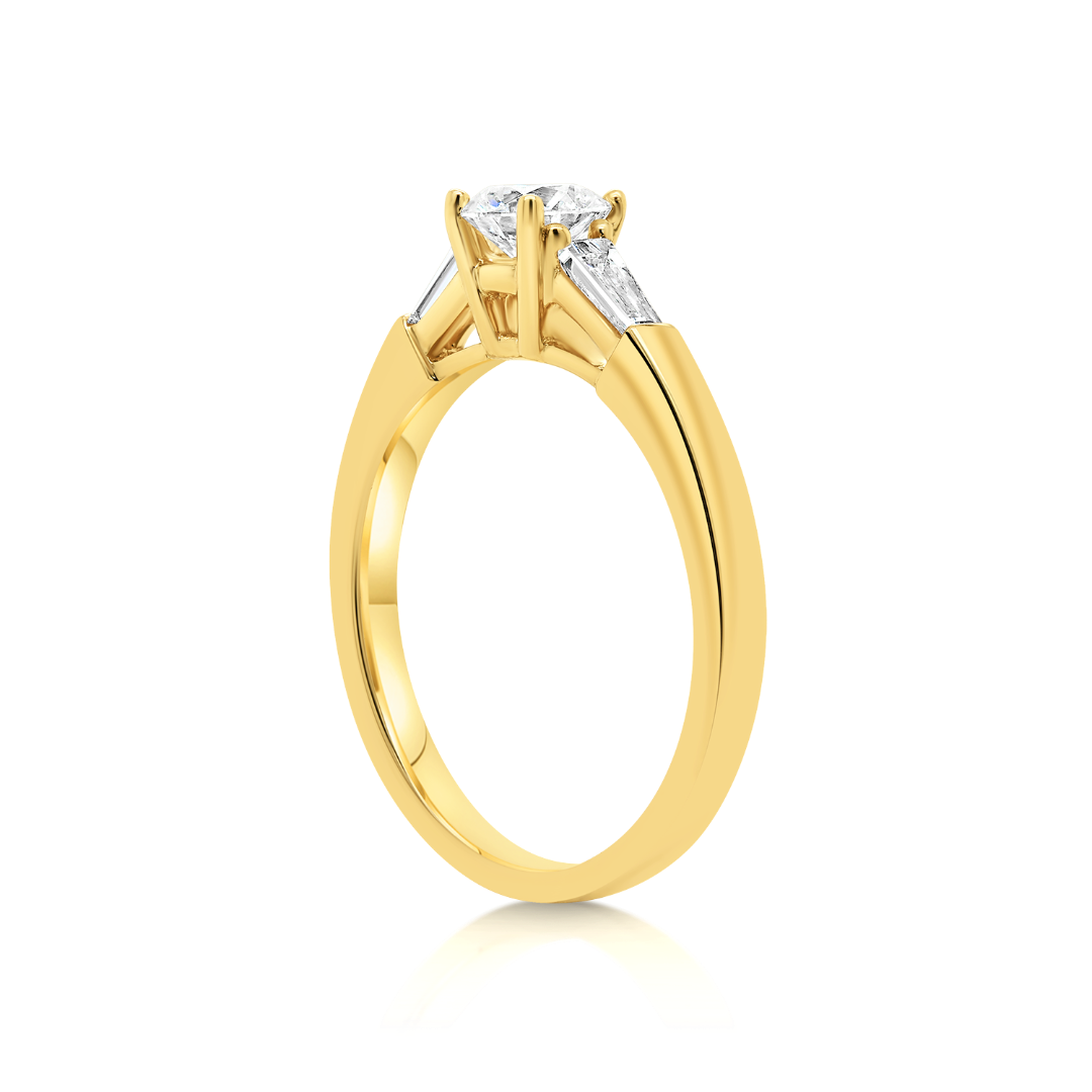 Inel de logodnă din aur galben de 18K, încrustat cu un Diamant Round Brilliant de 0.50ct. certificat la Institutul Gemologic GIA cu numărul 6442683086 și două Diamante laterale Tapers de 0.25ct.