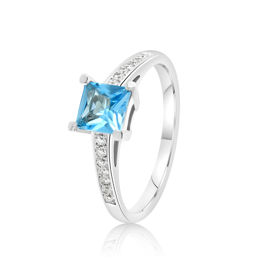 Inel din aur alb de 18K, încrustat central cu un Blue Topaz de 0.75ct și 14 Diamante naturale Round Brilliant de 0.11ct.