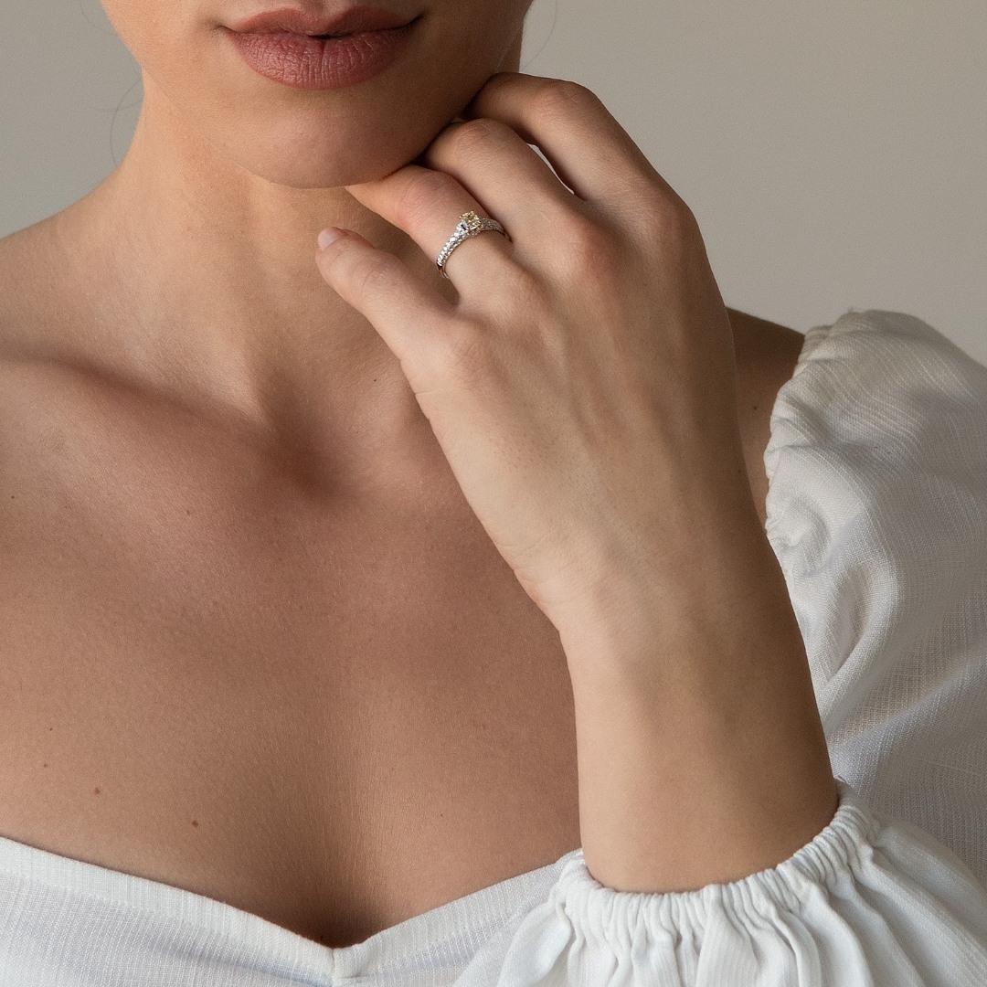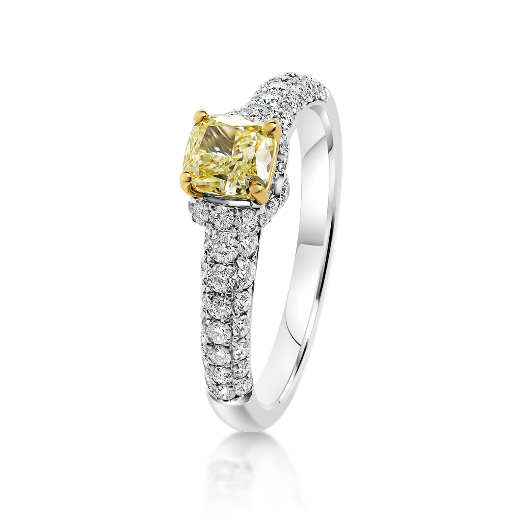 Inel din aur alb de 18K, încrustat cu 58 de Diamante Round Brilliant de 0.50ct și un Diamant Fancy de 0.55ct.