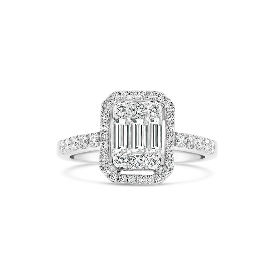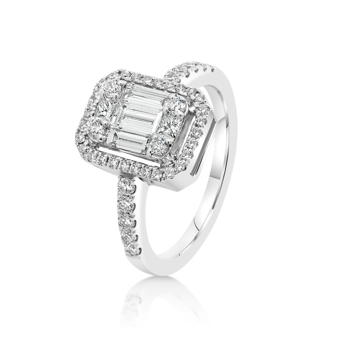 Inel de logodnă din aur alb de 18K încrustat cu Diamante Baguette, Princess și Brilliant cut.