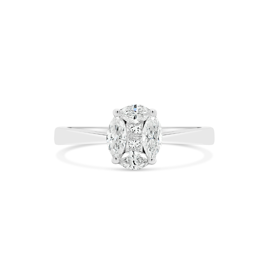 Inel de logodnă din aur alb de 18K cu Diamante Marquise și Princess cut.