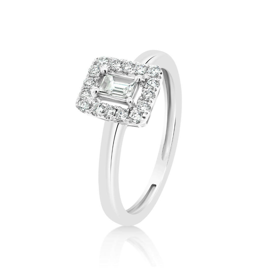 Inel de logodnă din aur alb de 18K, cu 16 Diamante round brilliant de 0.166ct și un Diamant baguette de 0.143ct.