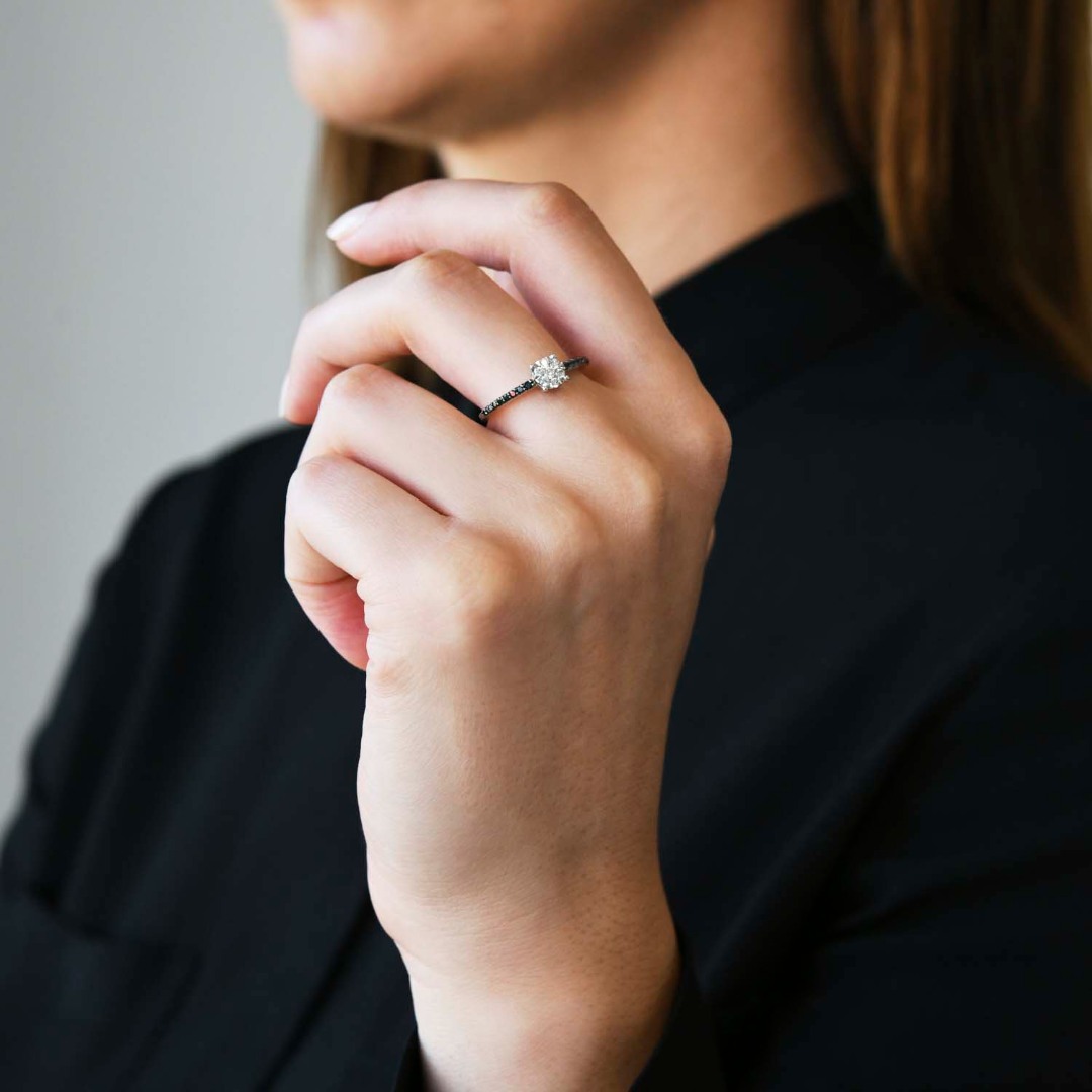 Inel cu Rodiu negru din aur alb de 18K, încrustat cu Diamante incolore de 0.16ct și Diamante negre de 0.08ct.