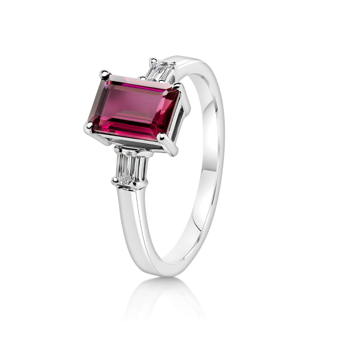 Inel din aur alb de 14K cu un Rodolit de 1.14ct și două Diamante Baguette de 0.08ct.