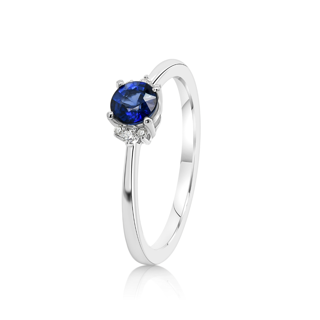 Inel din aur alb de 18K, încrustat cu 6 Diamante Round Brilliant de 0.04ct și un Safir albastru de 0.35ct.