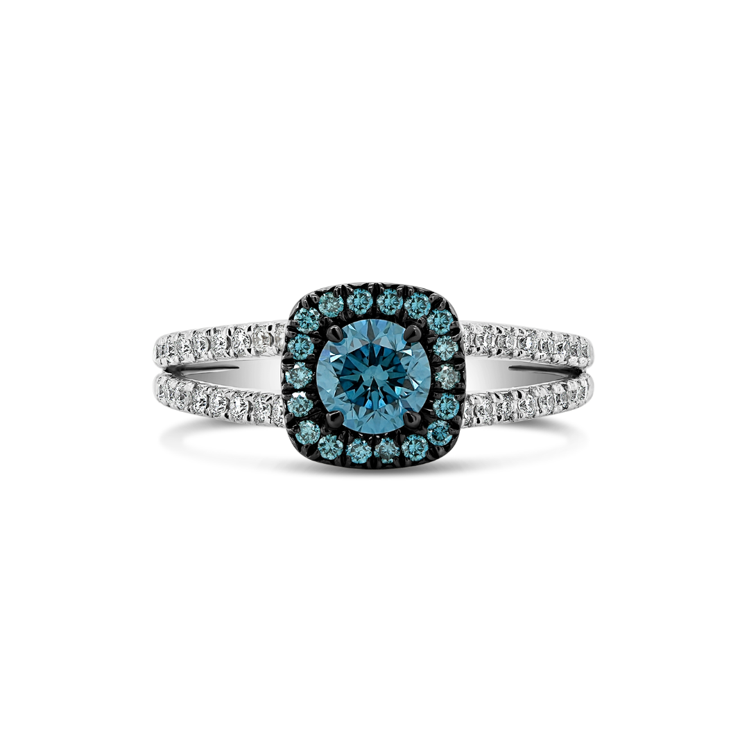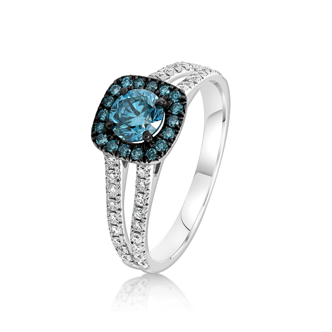 Inel din aur alb de 18K cu rodiu negru, încrustat cu 36 de Diamante albe de 0.22ct, 18 Diamante Ice Blue de 0.11ct. și un Diamant central Ice Blue de 0.49ct.