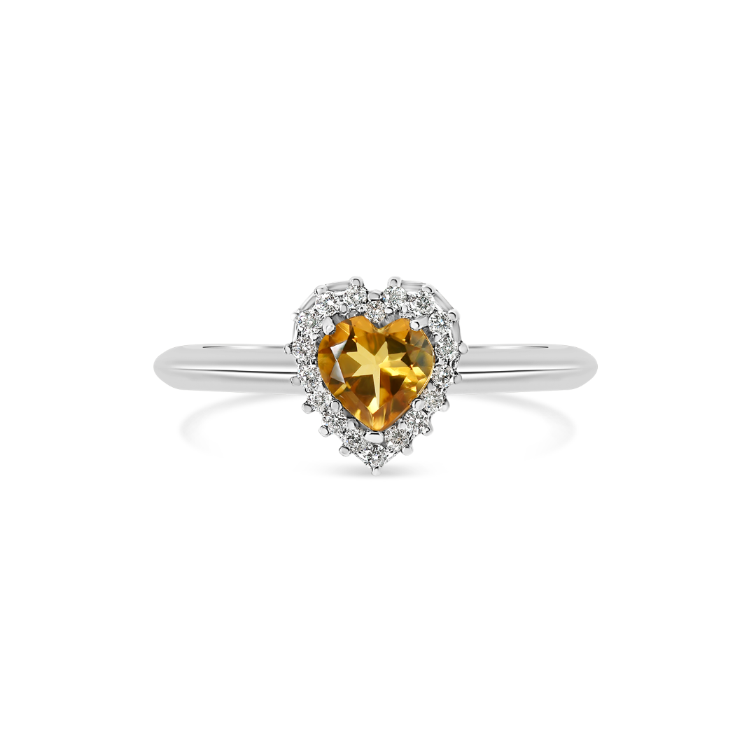 Inel din aur alb de 18K, încrustat cu 18 Diamante de 0.09ct. și o piatră Citrin de 0.38ct. în formă de inimă.
