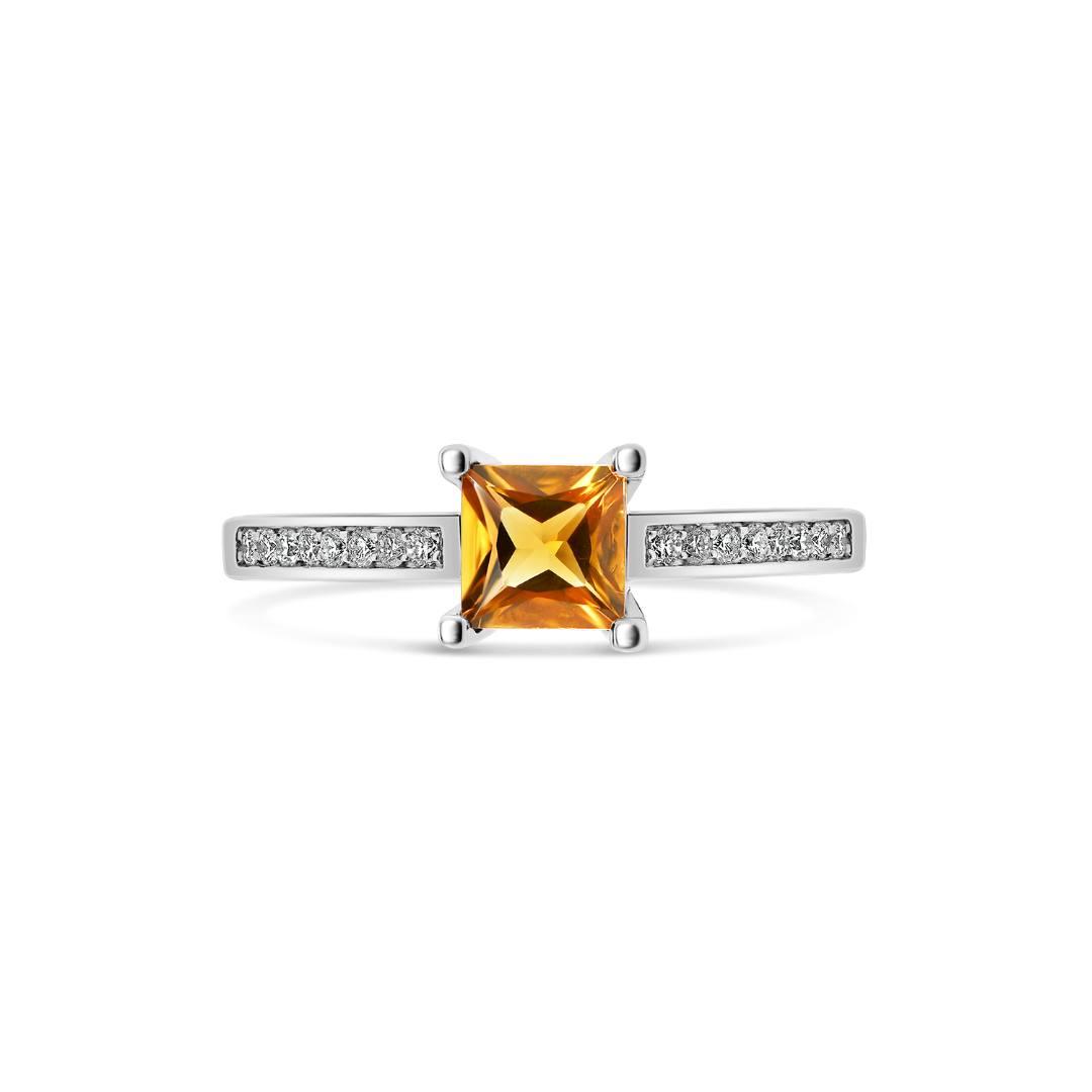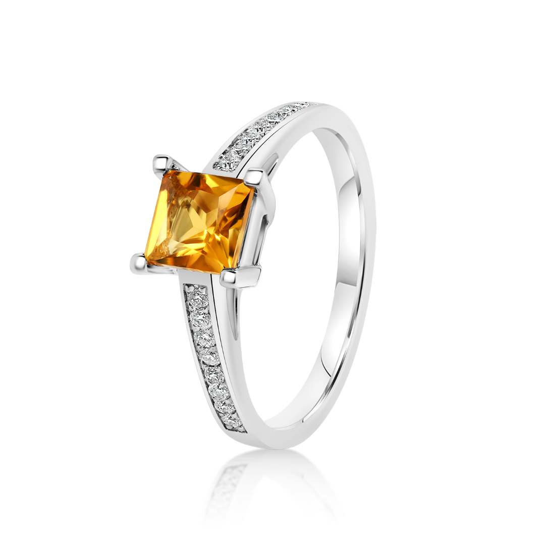 Inel din aur alb de 18K încrustat cu 16 Diamante Round Brilliant de 0.13ct și un Citrin de 0.55ct.