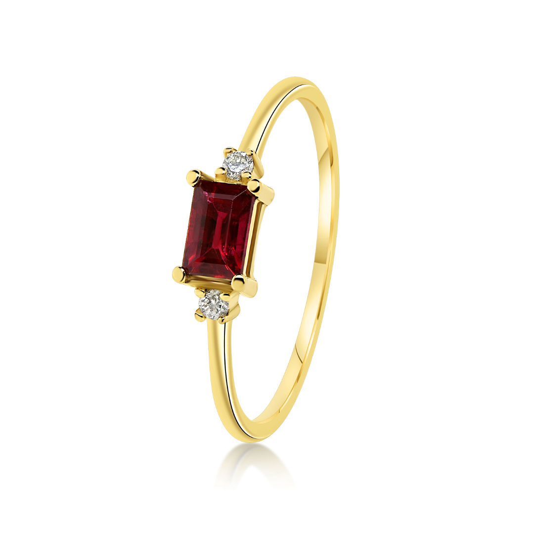 Inel din aur galben de 18K, cu 2 Diamante Round Brilliant de 0.03ct. și o piatră centrală Rubin de 0.36ct.