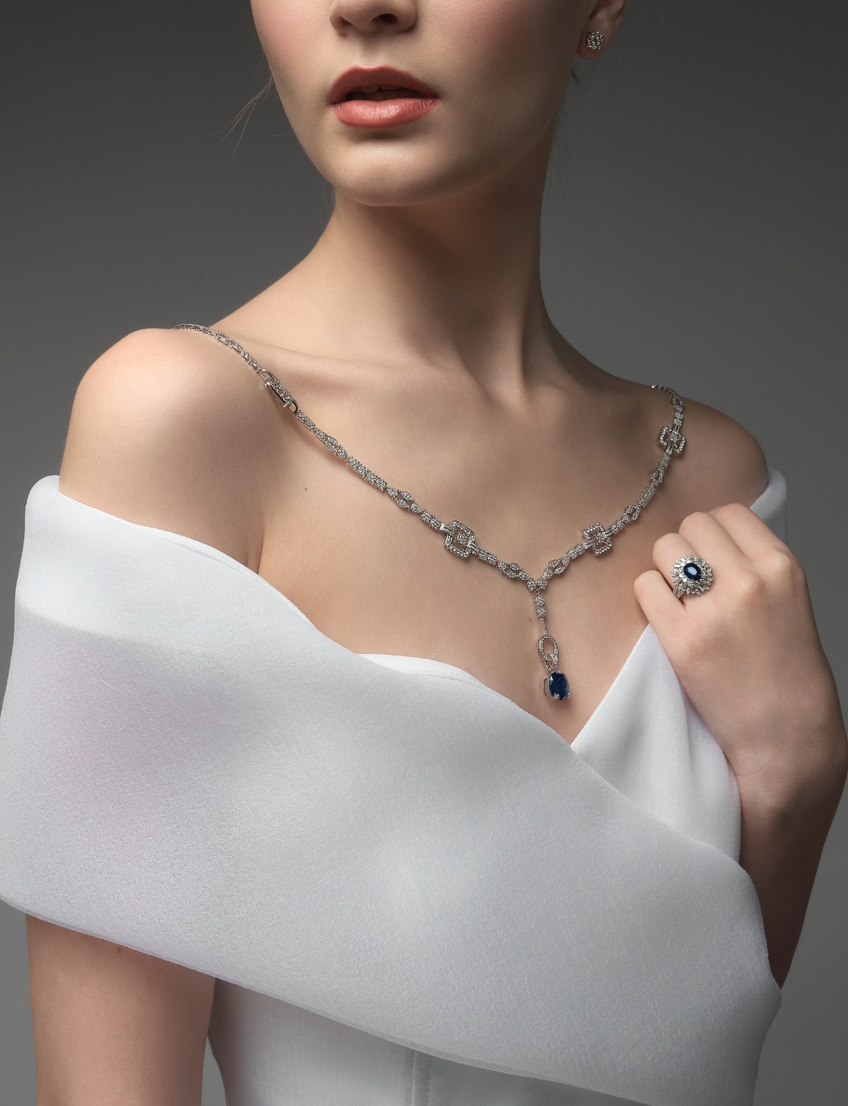 Colierul face parte din colecțiea Queen’s Heart, dedicată Reginei Maria a României. Realizată din aur de 18K, bijuteria este încrustată cu 1529 diamante de 16.95ct și un safir albastru, certificat la prestigiosul Institut Gemologic GIA de 9.33ct.